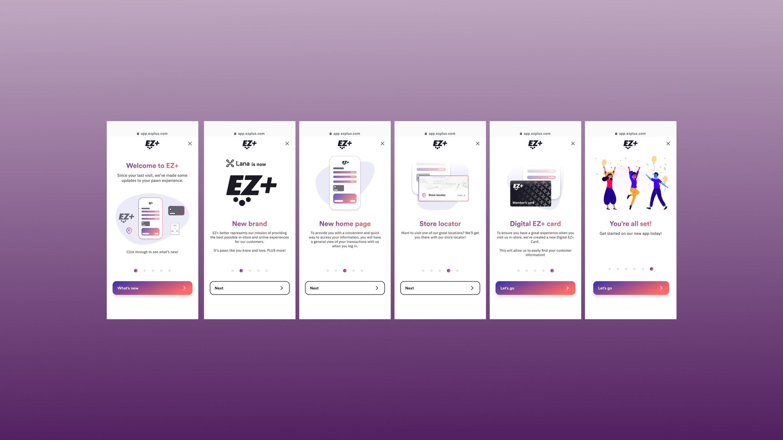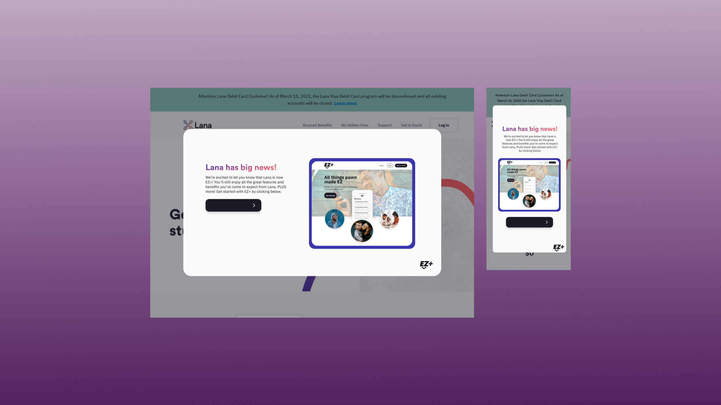 Although the challenge was complex, the solution was simplified through structured design sprints, intentional timelines, and disciplined execution. Our first objective was to guide users arriving at the legacy Lana site by clearly communicating the transition to EZ+ and providing a strong call-to-action that directed them to the new platform. Once on EZ+, users could seamlessly log in or sign up and were greeted with a clear onboarding message highlighting the expanded benefits and added value of the new experience.